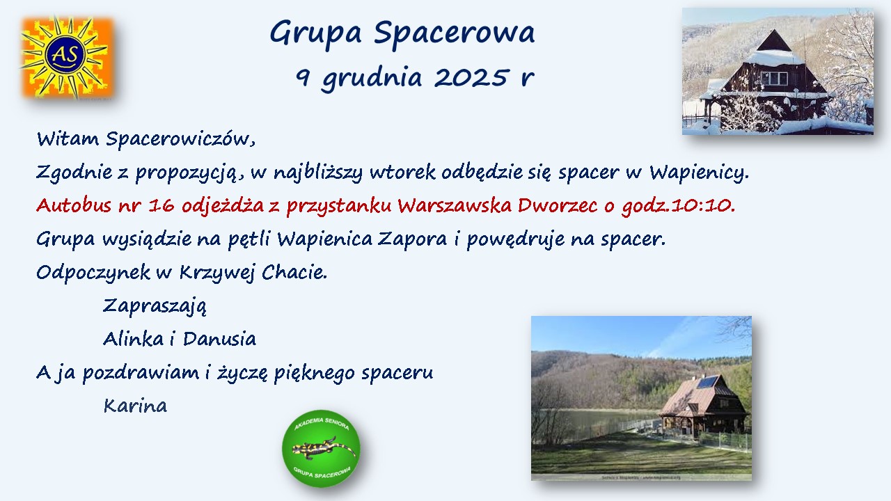 Kategorie: Aktualności, Grupa Spacerowa. Autor: Akademia Seniora. Dodaj zakładkę do bezpośredniego odnośnika.