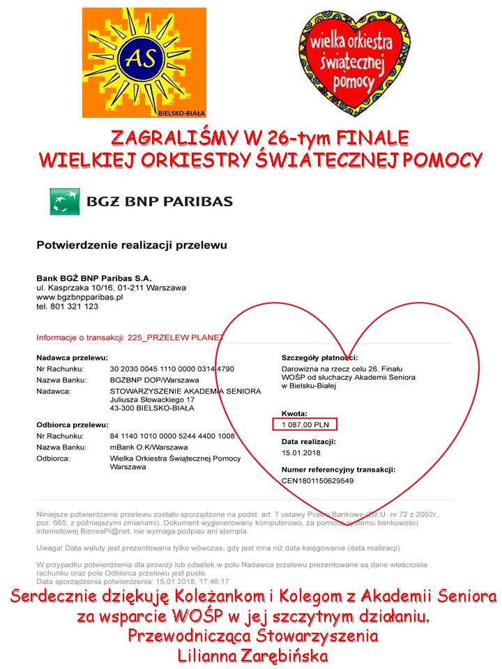 U nas też jest rekord zbiórki !!!! Opublikowany 16 stycznia 2018 przez Akademia Seniora W zeszłym roku zebraliśmy 873,0 zł, a w tym 1087,0 zł !!!!!